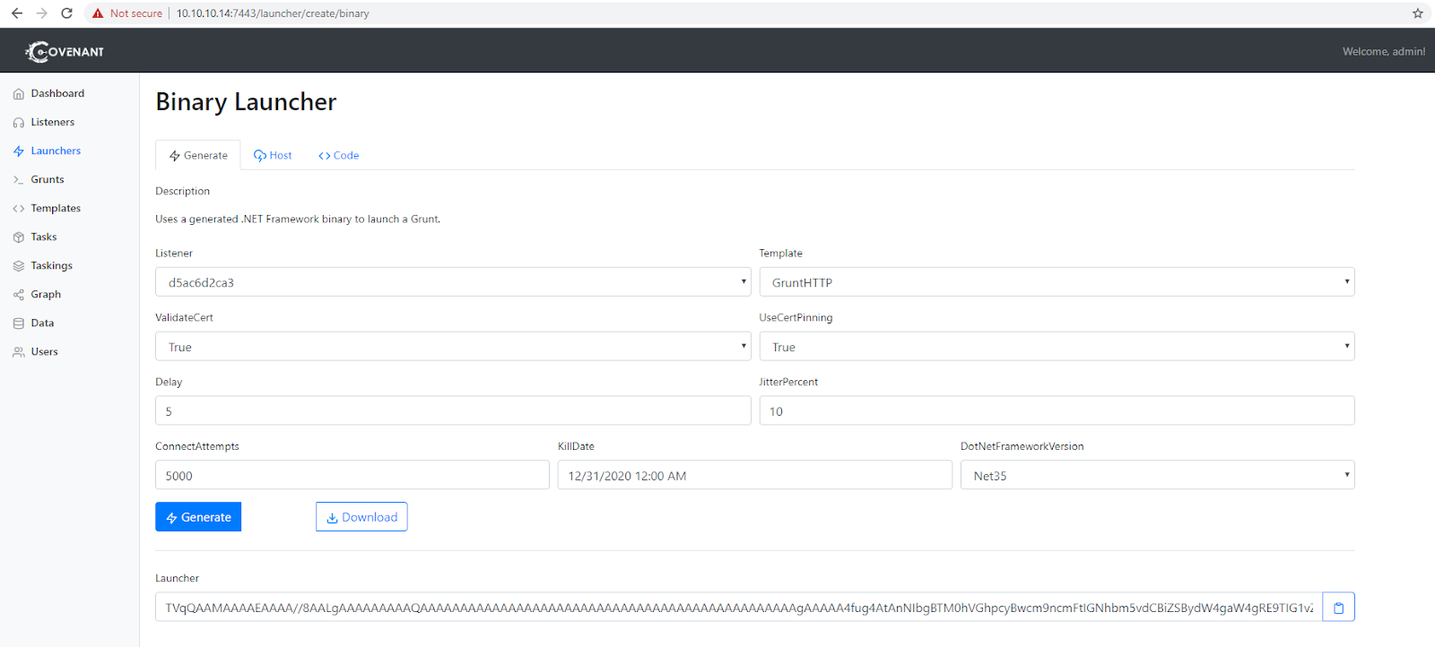 Step 1) Generate the binary launcher and click on Download button to download the GruntStager.exe file.