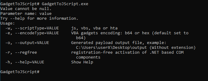 Step 5) Execute GadgetToJScript.exe to generate JS payload for covenant grunt.