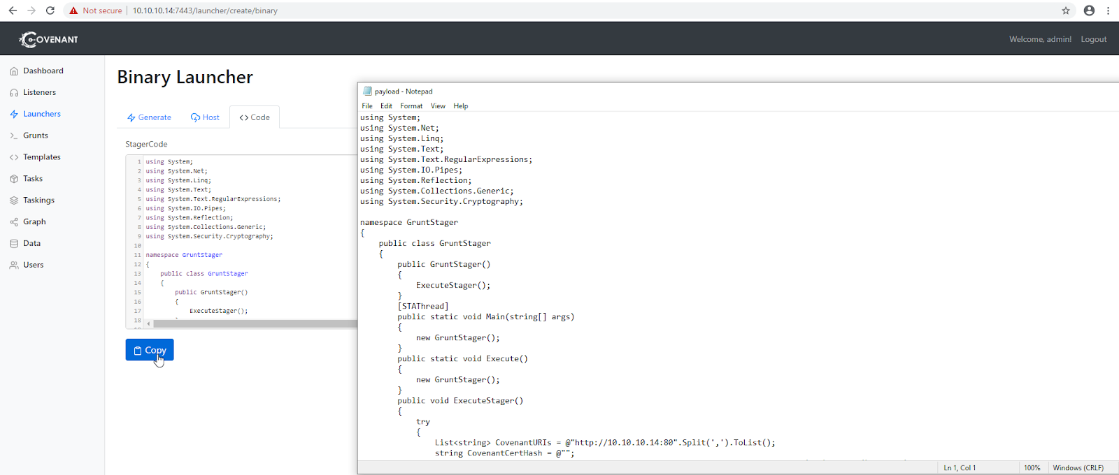 Step 1) Copy the GruntStager code from the Covenant UI and paste it in the payload.txt file.