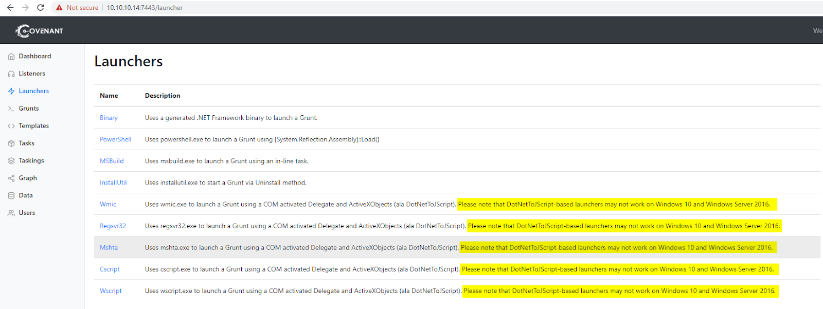 Covenant uses DotNetToJScript for generating payloads in hta / js format which indeed doesn't work well with Windows 10 environment. We can see the note in the description field.